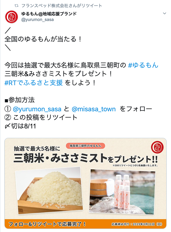 参加自治体様の特産品PRを目的としTwitter上でのプレゼント企画です。
